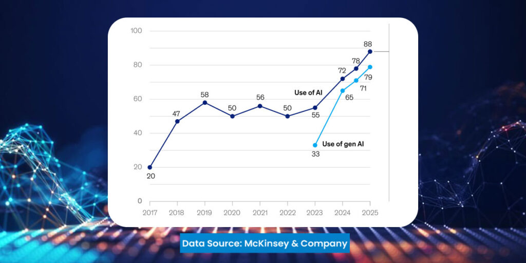 – 88% of organizations now use AI in at least one function, up from 78% in 2024.