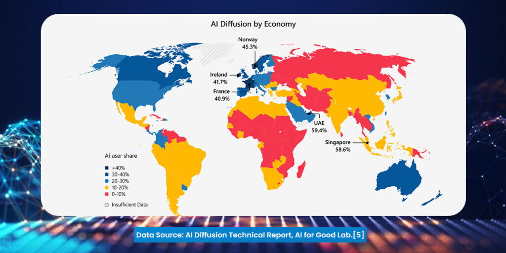 Microsoft’s report puts the UAE above Singapore, Norway, and Ireland, countries known for their digital readiness but not necessarily for creating foundational AI systems. This indicates that the future of AI competitiveness will rely more on policy support, workforce preparation, and national technology deployment.